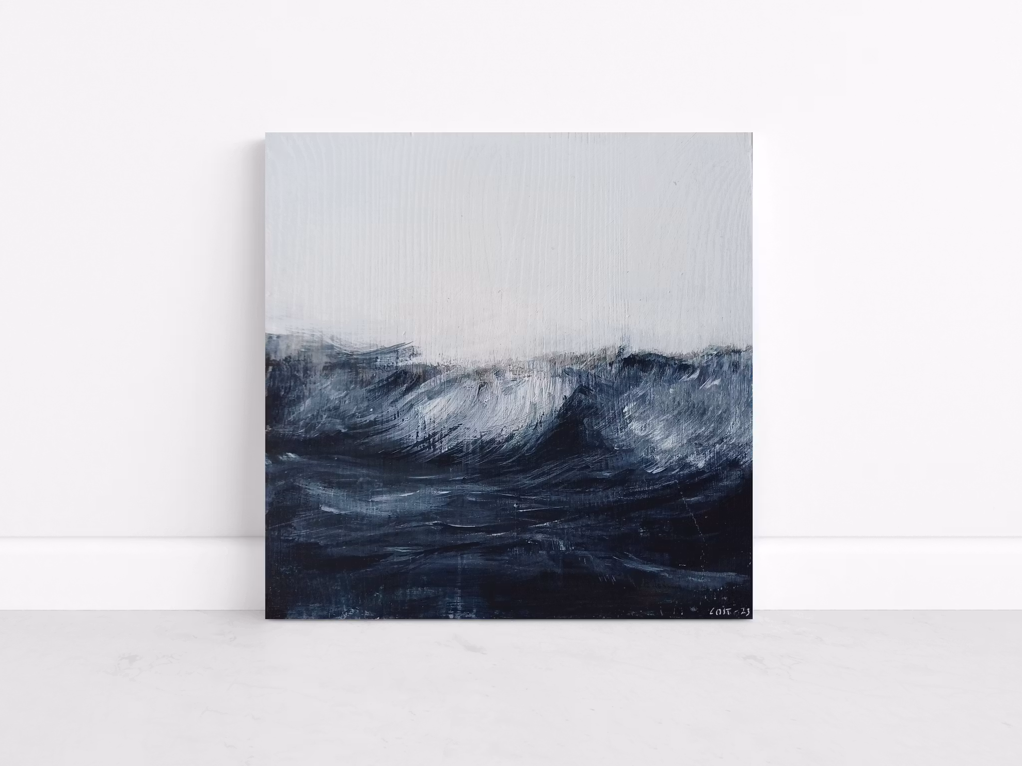 Originalmålning i akryl på spillvirke från brädgården, 17,5x18x1,8 cm. Kan hängas på vägg eller ställas på plant underlag.