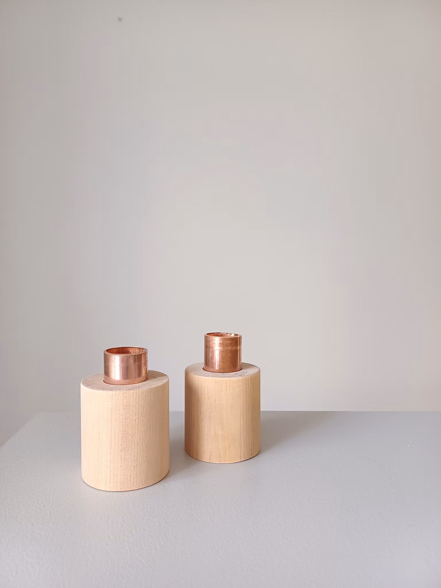 Ljusstake tillverkad av utsliten brödkavel och vvs rör i koppar.